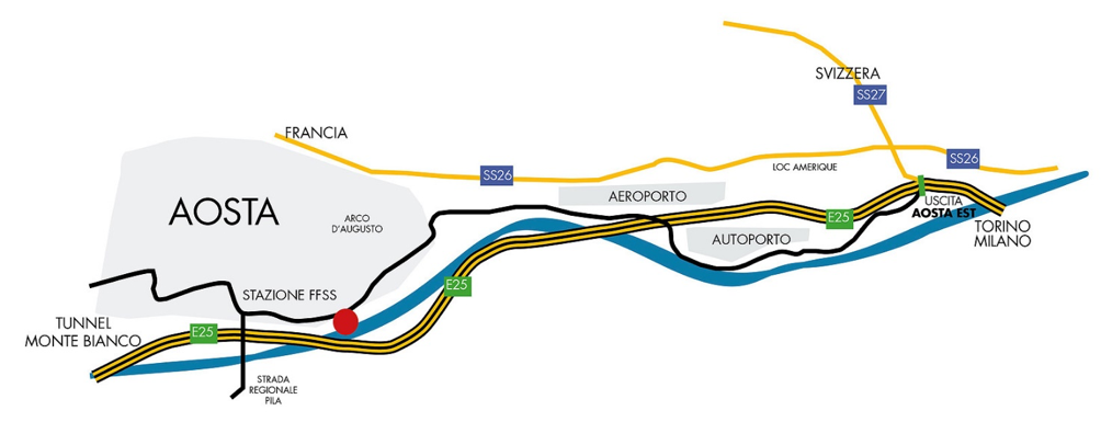 All’uscita dall’autostrada Aosta Est seguire le indicazioni per Aosta Centro; dopo 3,5 Km svoltare a destra seguendo le indicazioni per il quartiere Dora/giudice di pace; proseguire per circa 350 m. e alla rotonda prendere la seconda uscita per via Vittime Col du Mont/via Lavoratori; proseguire per circa 1,4 Km. e alla rotonda prendere la seconda uscita; svoltare a sinistra per giungere a destinazione.